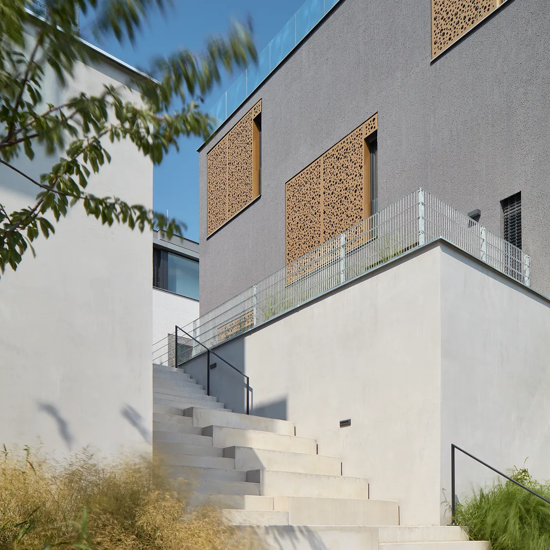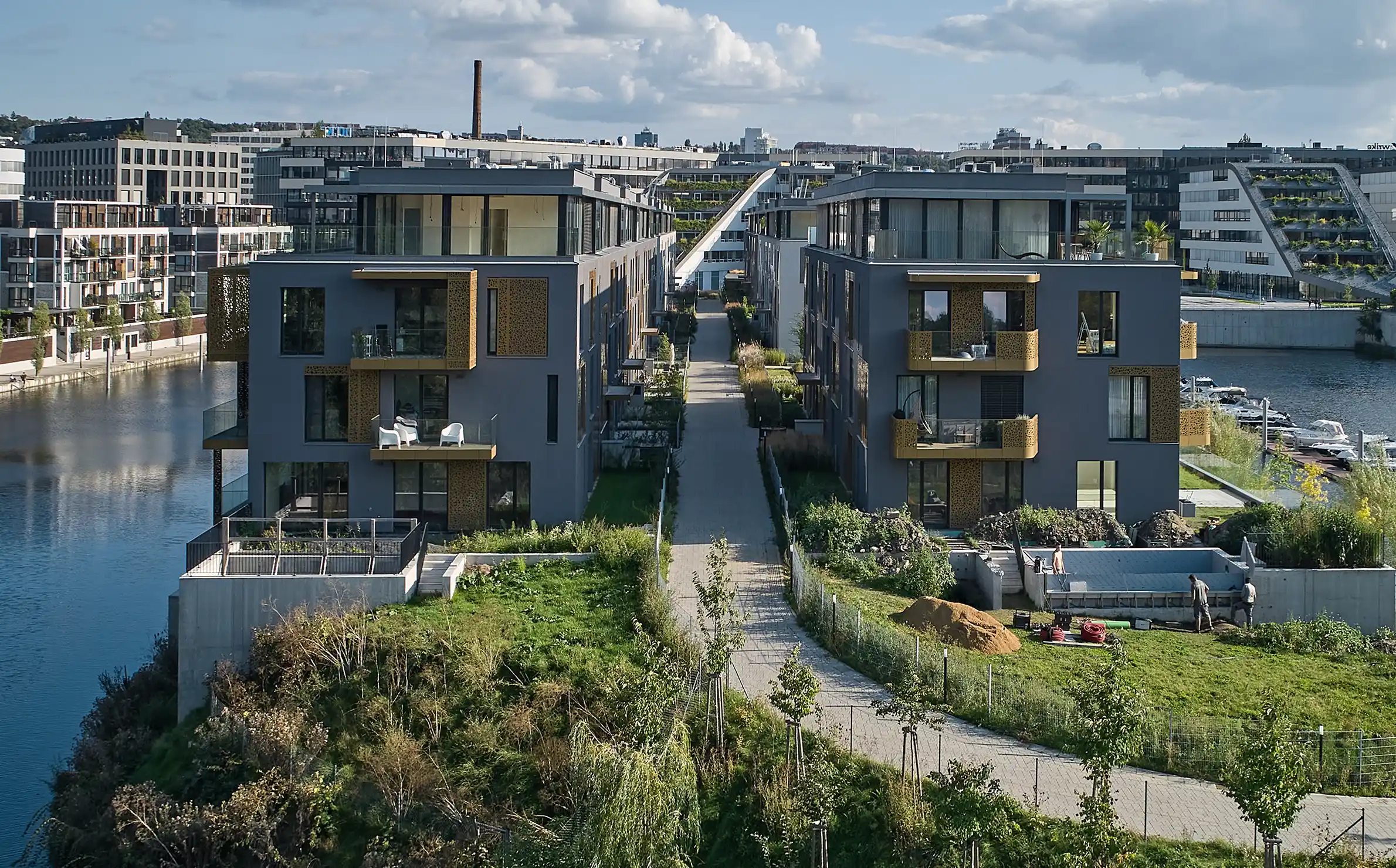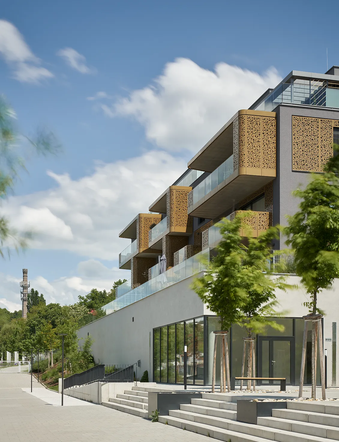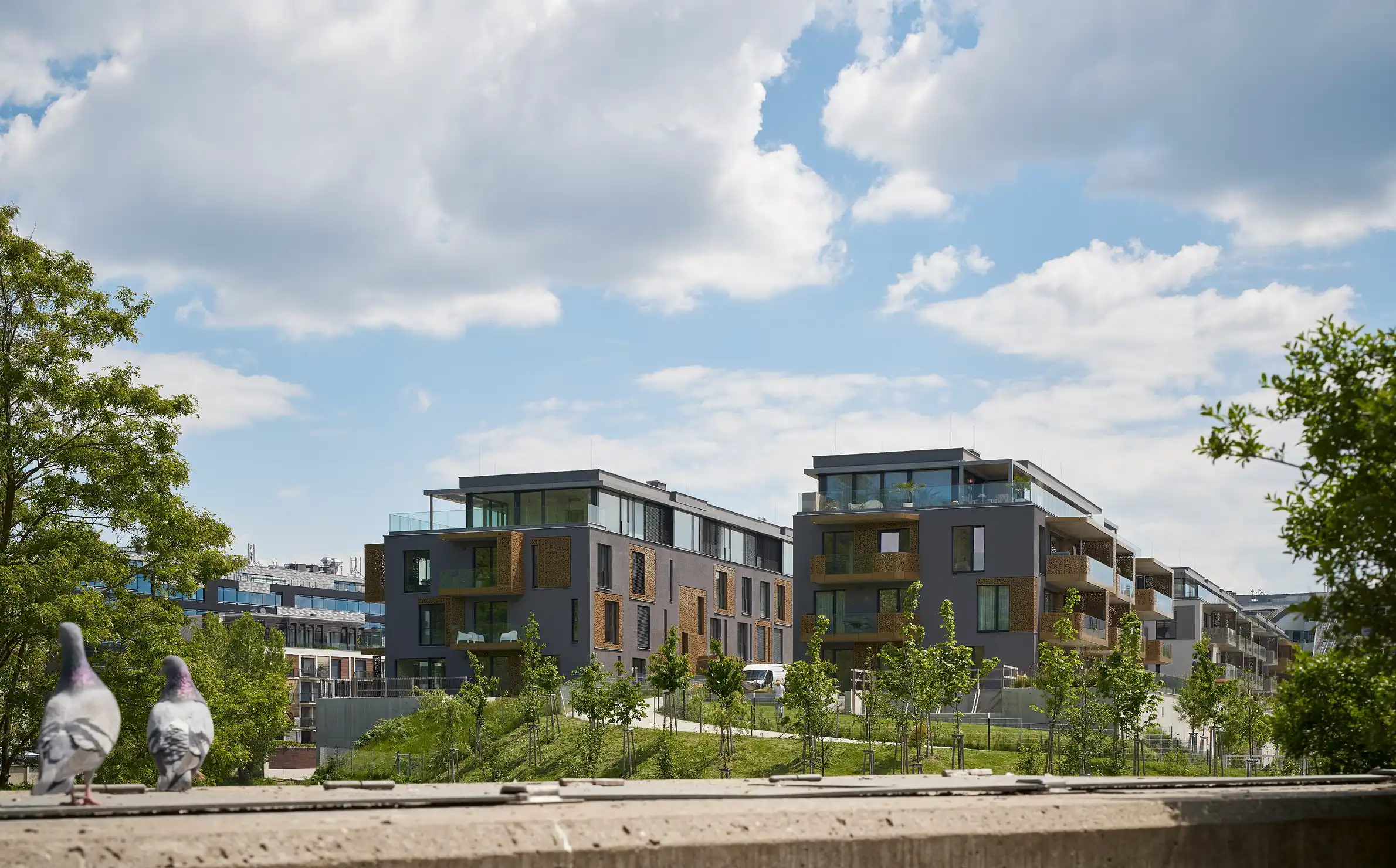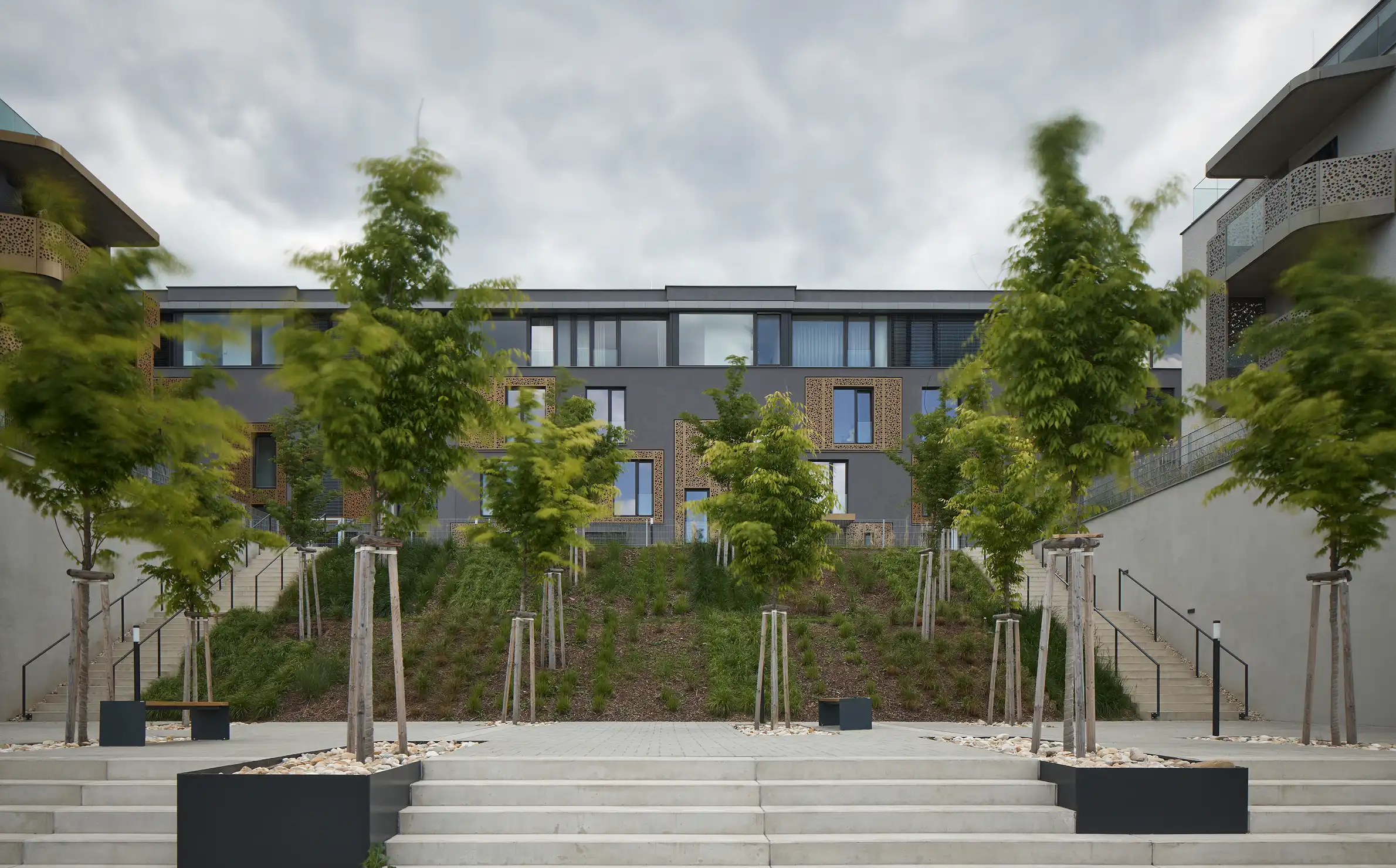 Domy jsou čtyřpodlažní, ale opticky je snižují prosklené penthousy nejvyššího patra. Ulice tak dostává příjemné lidské měřítko. Celkem 150 bytů je rozděleno na 12 vstupů, a každý obyvatel má maximálně dva sousedy na patře, díky čemuž je bydlení pohodlné a intimní.