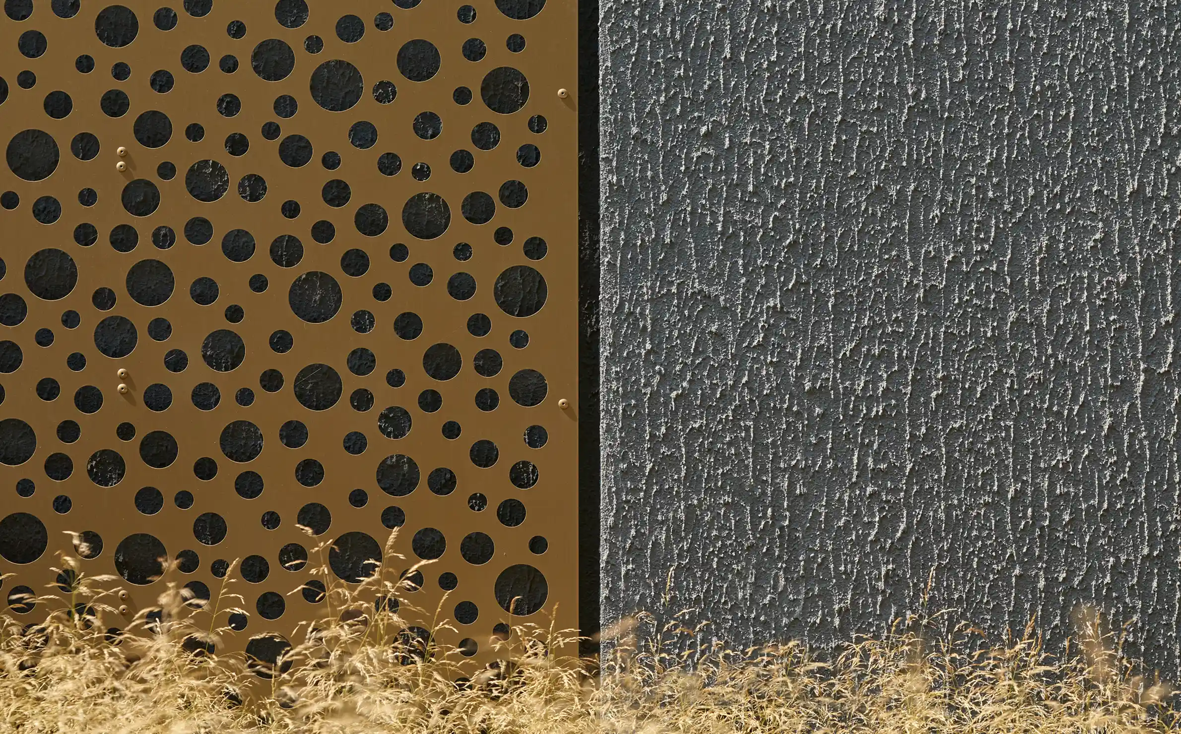 Efekt umocňuje také kombinace zvolených materiálů – omítky ve válečkované struktuře a speciálně vyvinuté plechové panely ze samonosných dvojitých skořepin zdůrazňují čistý design „bublinové perforace“, která odkazuje na vodní hladinu. Vázací ocelové kruhy nebo mola jsou pak perfektními funkčními doplňky.