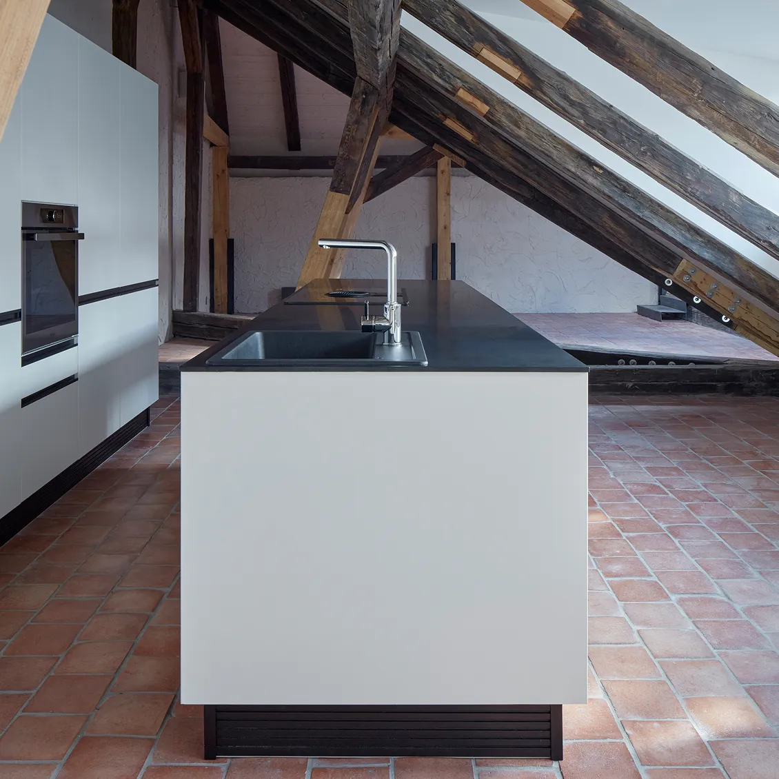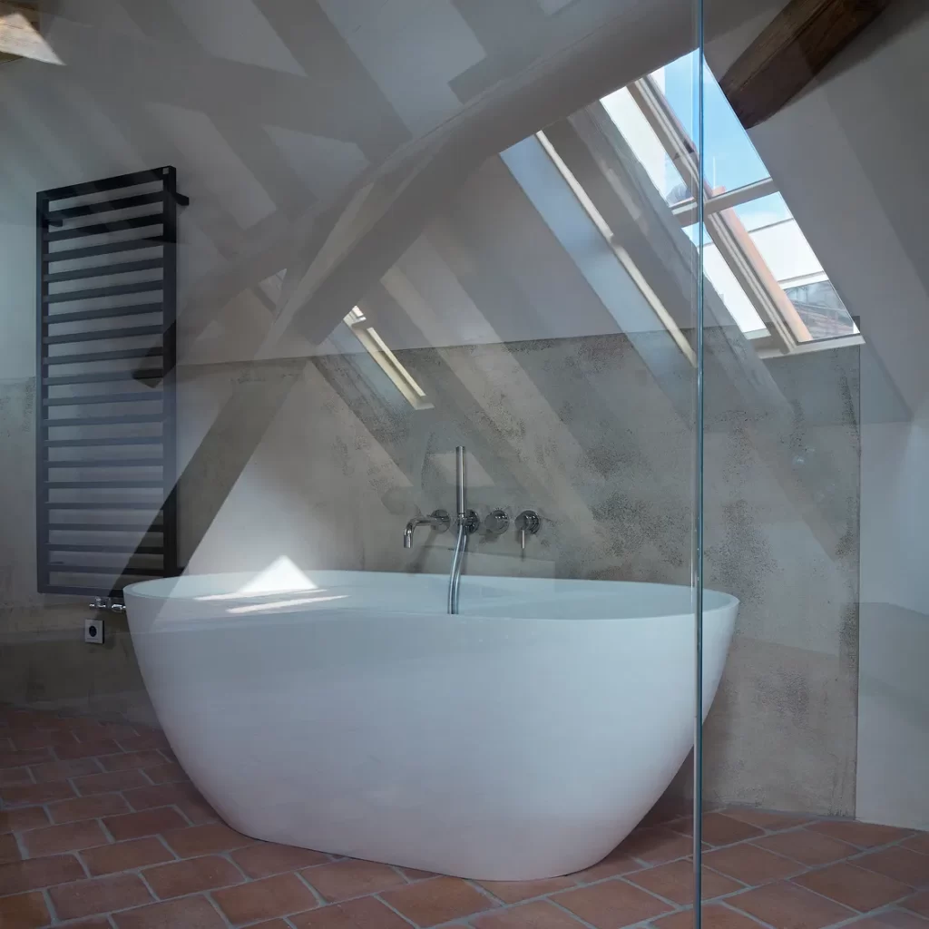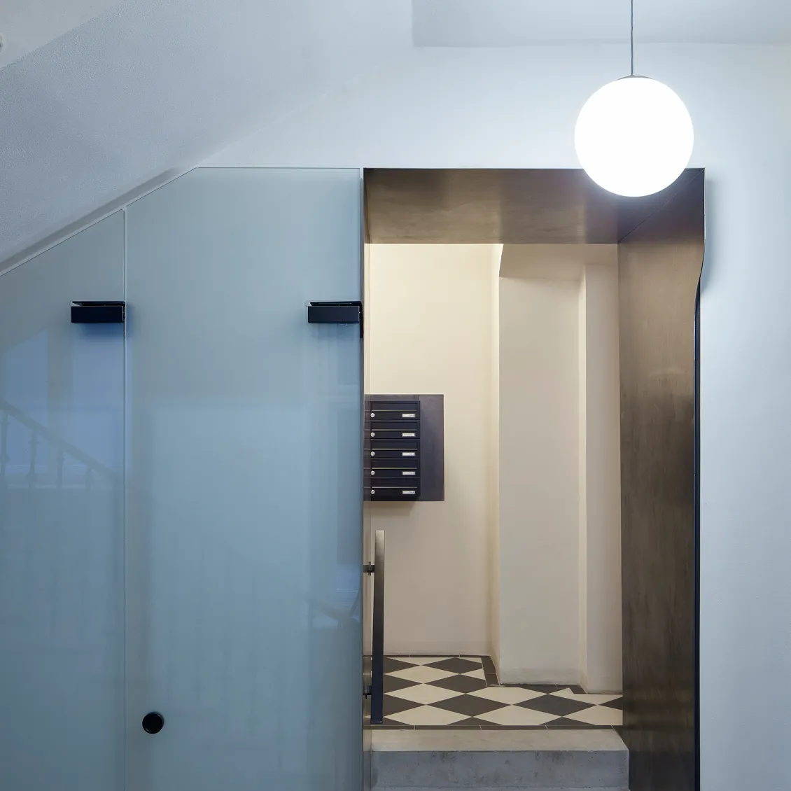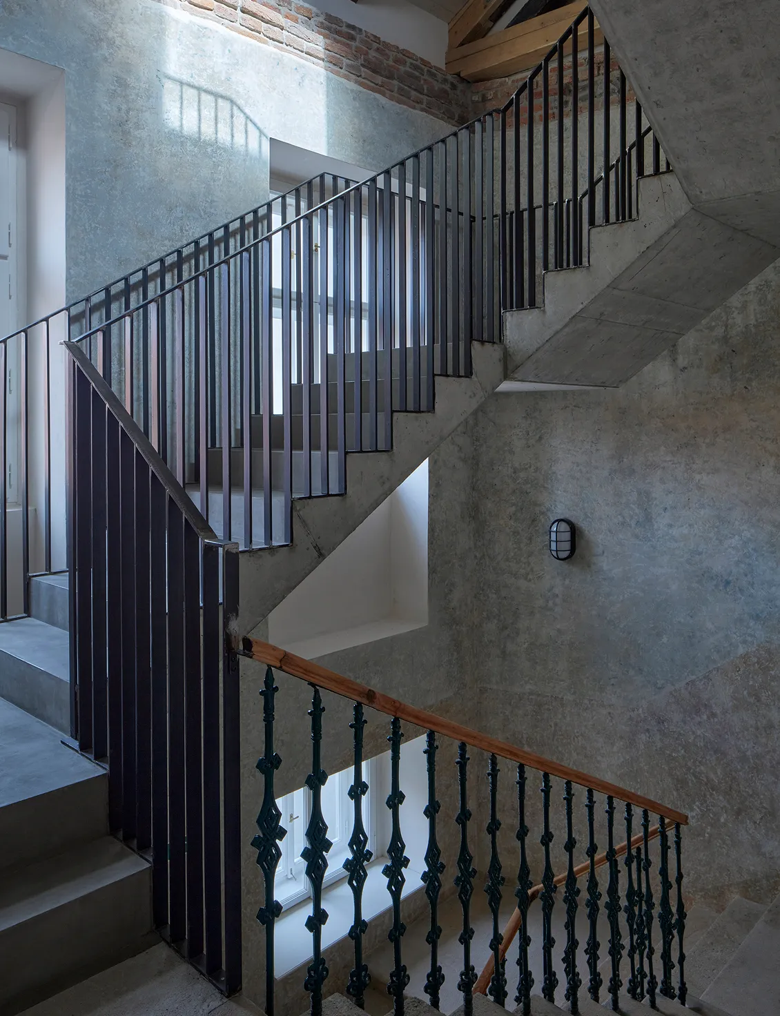 Zvolili jsme proto přístup založený na odhalování a estetizování skrytých historických vrstev, které jsme postavili do kontrastu s novými architektonickými prvky, přičemž jednotícím elementem se staly použité materiály – kov, sklo a beton ve své ryzí podobě se domem nenápadně prolínají a zároveň provádí obyvatele jeho historií.