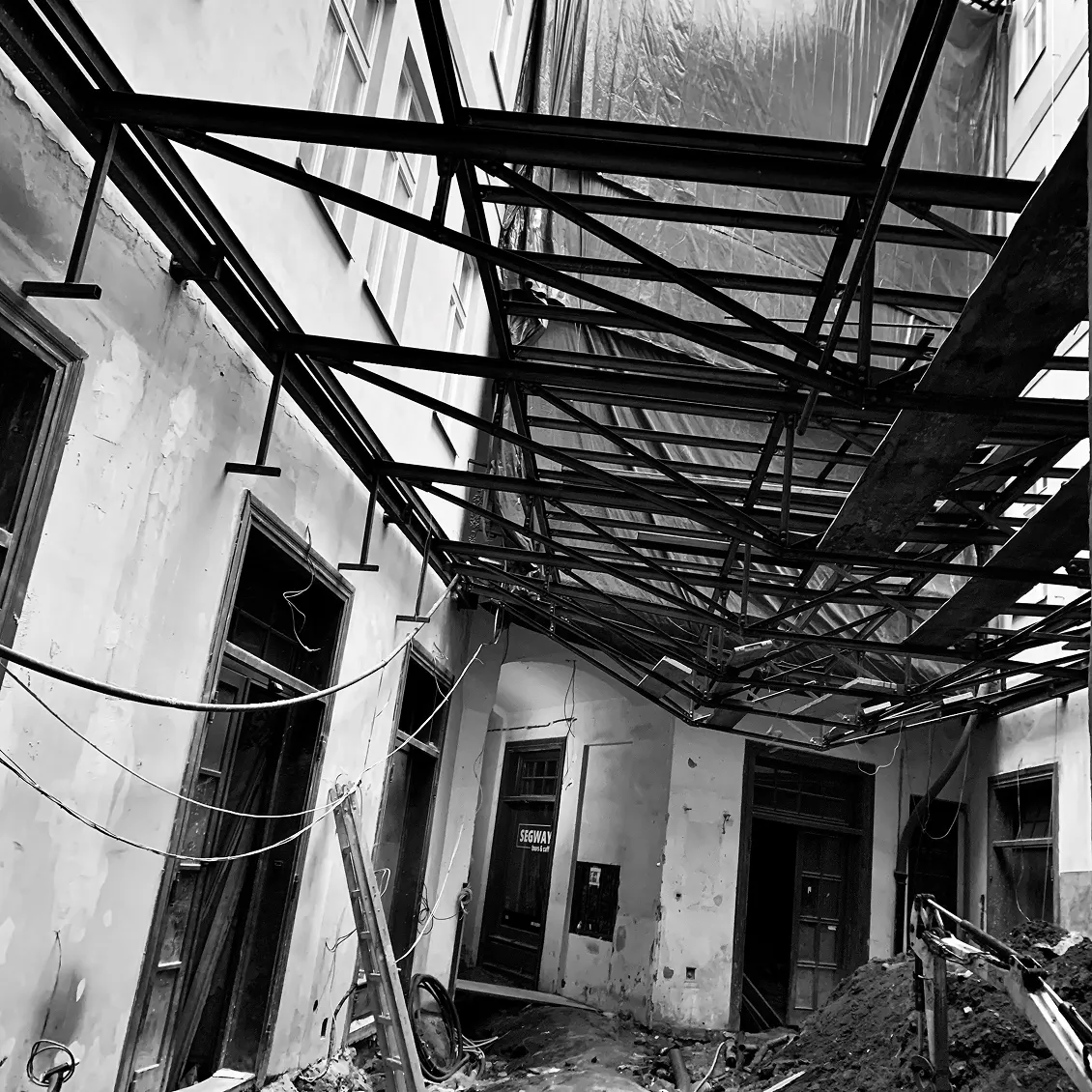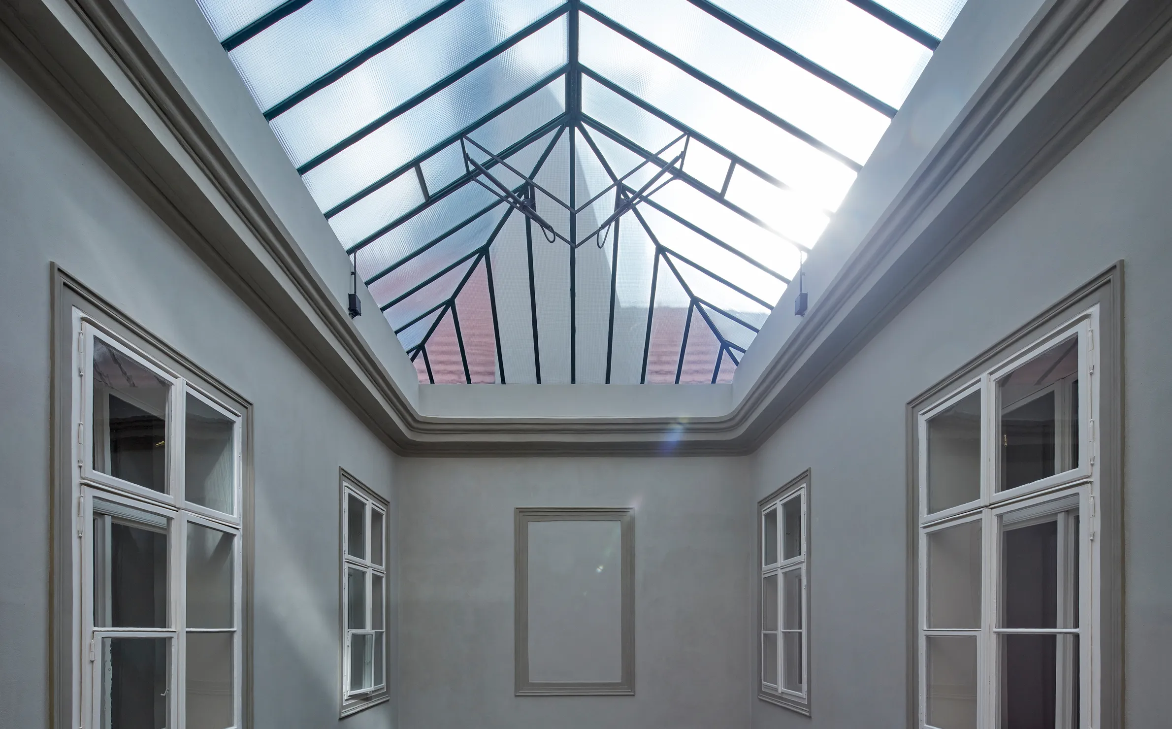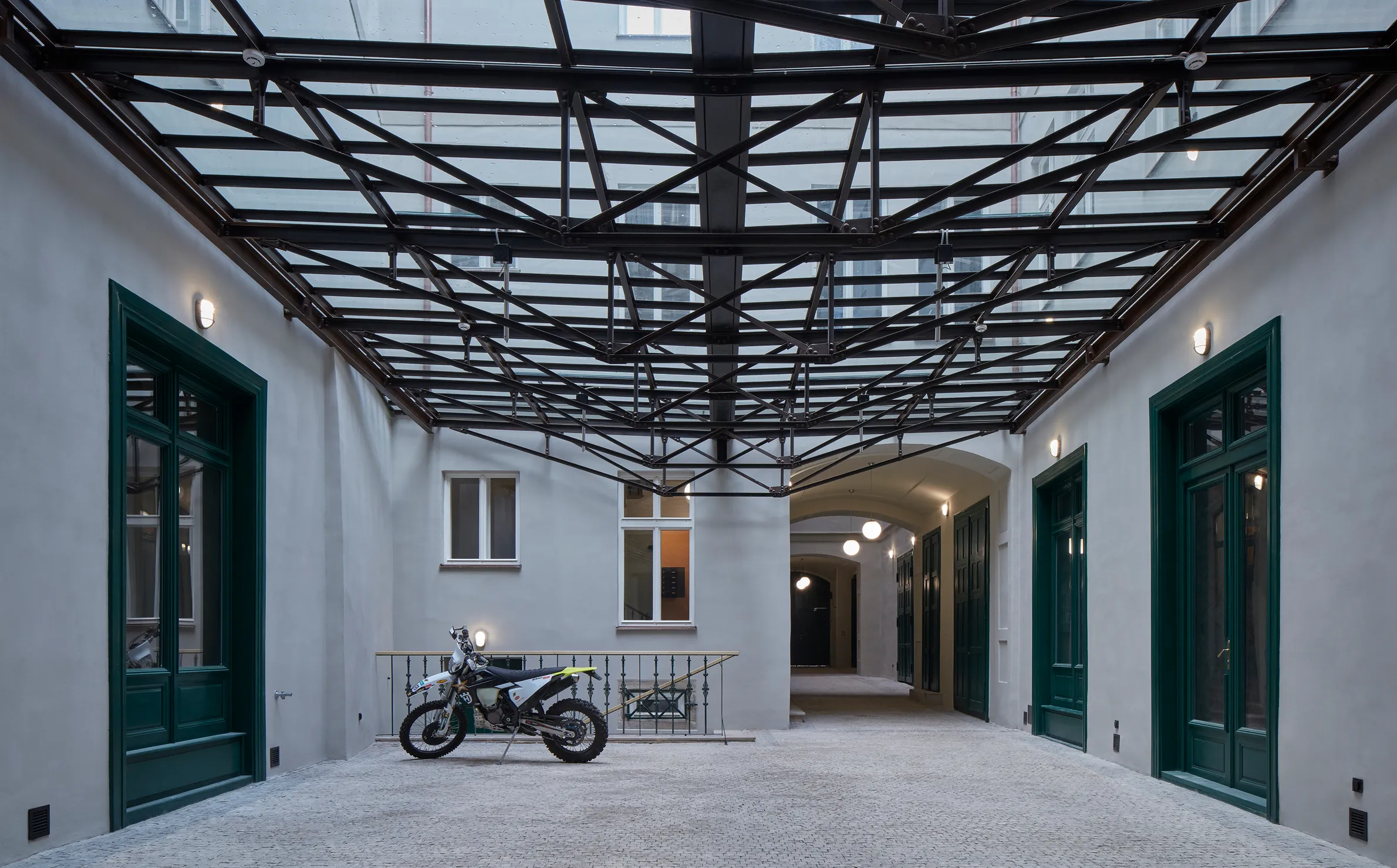Podařilo se nám také obnovit zastřešení hlavního dvora v jeho původní podobě. Nýtovaná konstrukce s prosklenou střechou byla z bezpečnostních důvodů sejmuta při bombardování Prahy v roce 1945. Dohledali jsme historickou dokumentaci a díky tomu jsme mohli zastřešení restaurovat a znovu použít.