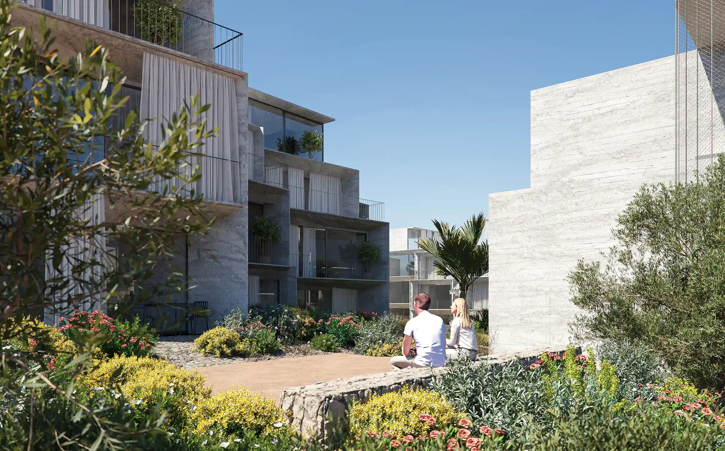 Velkorysé výhledy umocňuje kontrastní užití výrazných přírodních materiálů a detailů, díky nimž tu zeleň vytváří tichou intimitu a vodní prvky měří plynutí času. Moderní architektura využívá přírodní kámen či vrstvený, ručně hutněný beton z místního vápence.