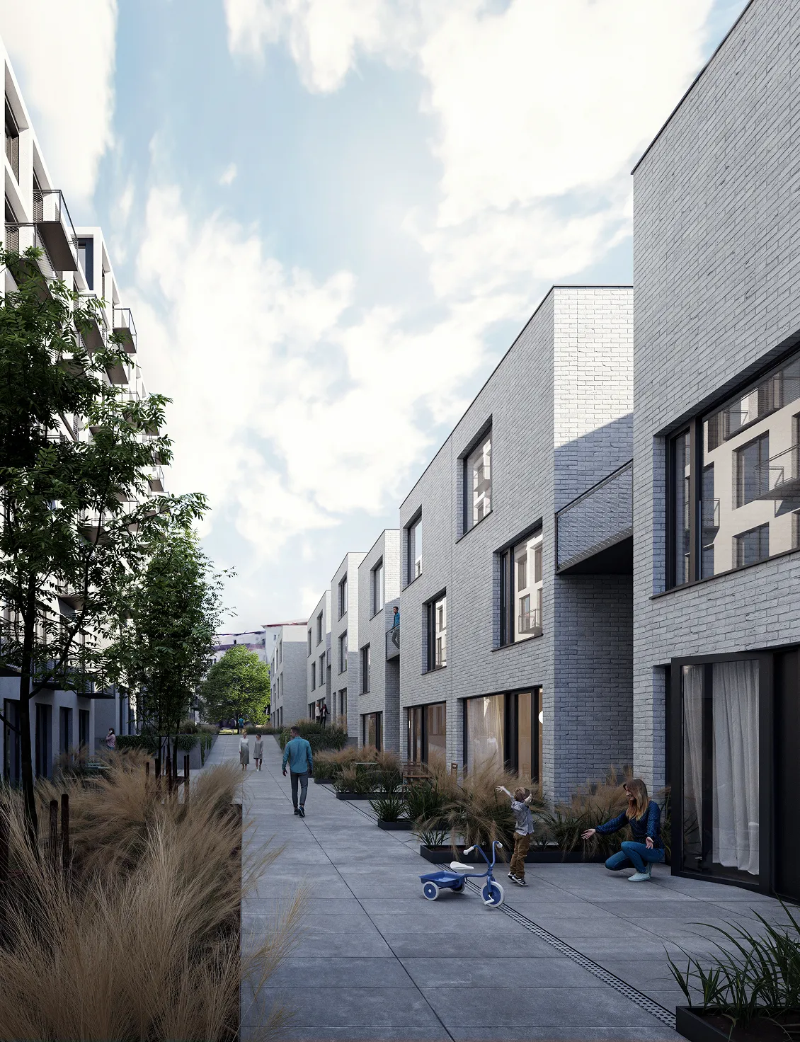 Příjemné lidské měřítko vnitřního prostoru i použité materiály mohou evokovat drobné holandské městské domy. Do vnitrobloku jsme navrhli výjimečnou formu bydlení, v nízkých domech s vlastní adresou a identitou, v centru města jedinečnou.