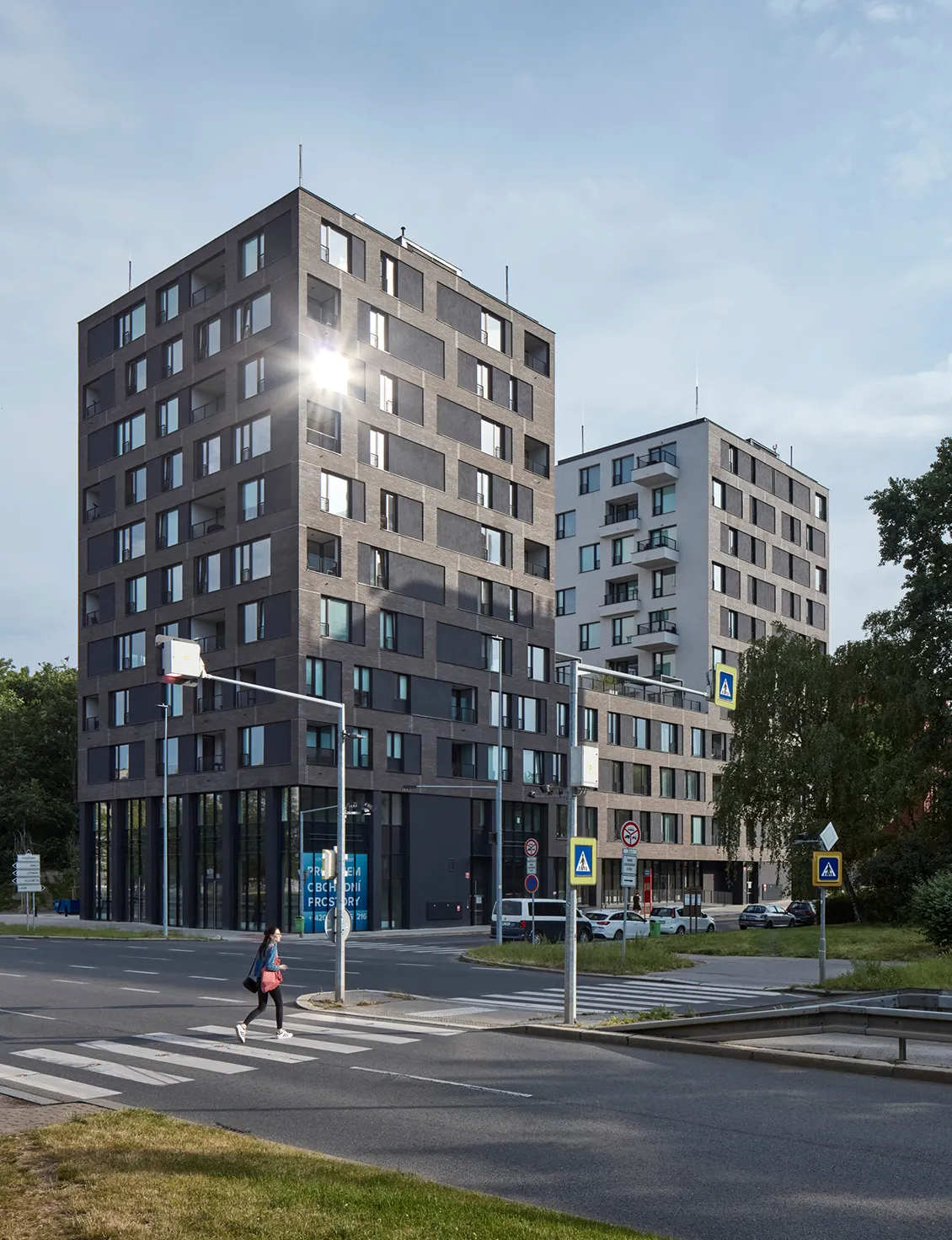 Vznikl tak dům o dvou věžích, z nichž jedna navazuje na směr stávajících dlouhých panelových domů a druhá vytváří velmi příjemné nároží nedaleko zastávky autobusu i metra.