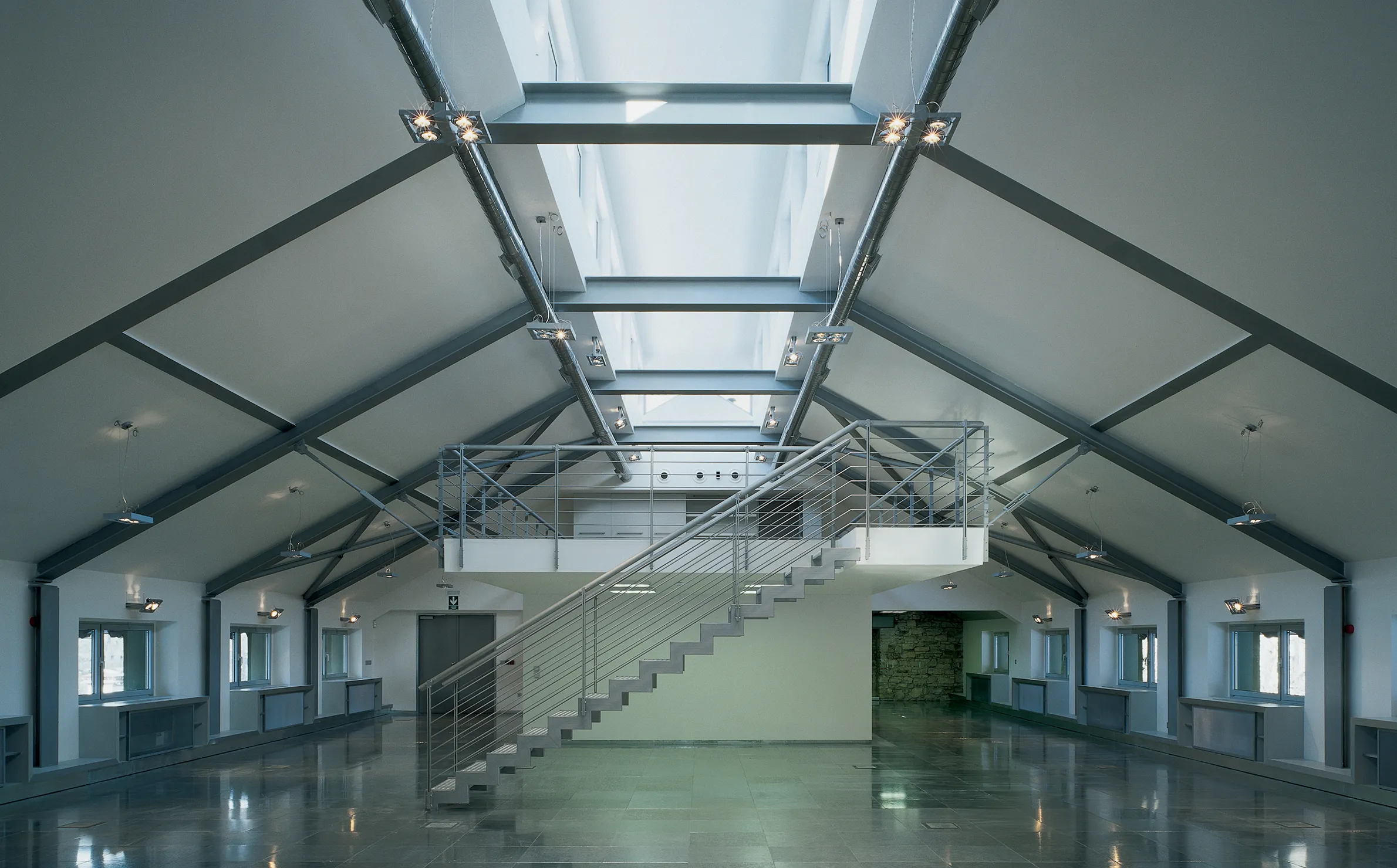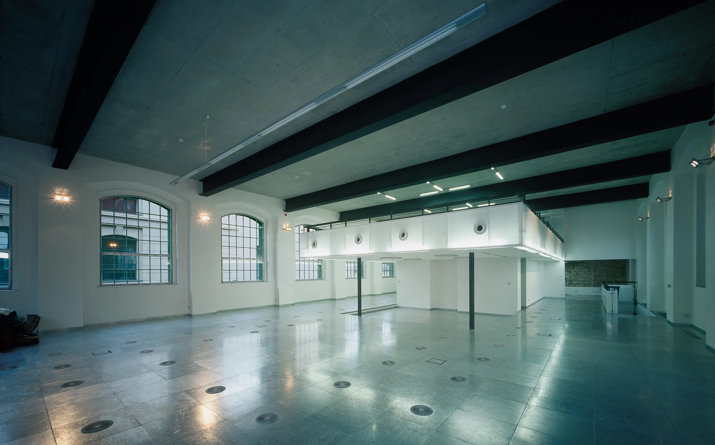 Uvnitř budovy vznikla tři nová podlaží, která se liší výškou, svou světlostí i atmosférou – od nízkého přízemí s těžkou ocelovou konstrukcí, přes hlavní patro s velkými okny, až po vzdušné světlé podkroví, kterému vévodí původní rozetové okno.