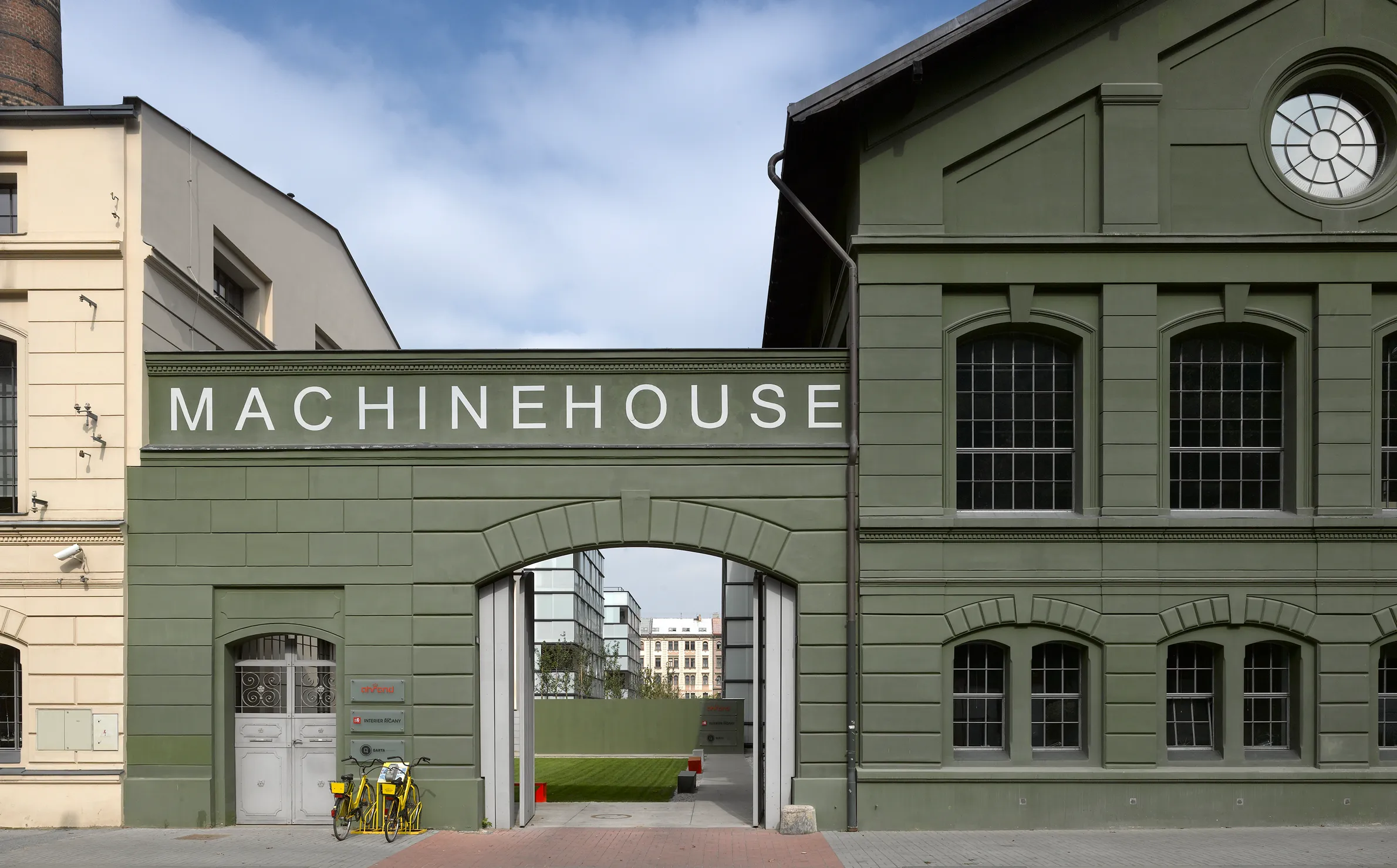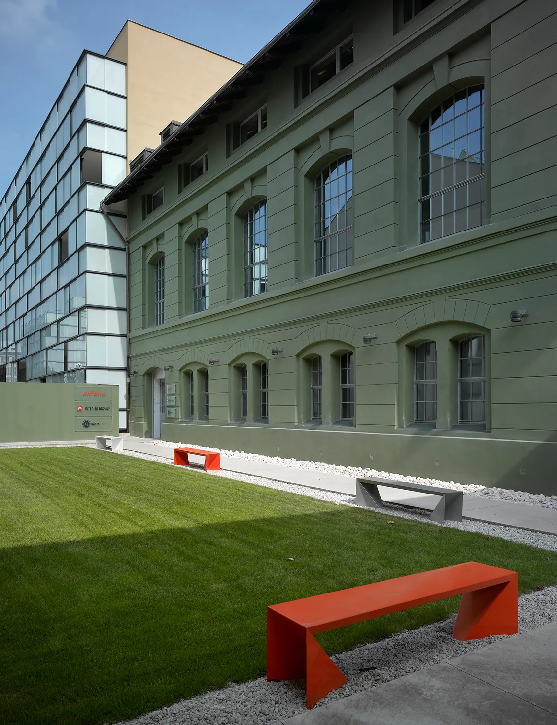 Dvůr v meziprostoru u vstupní části budovy je využíván jako přístup do budovy a zároveň díky příjemné zelené ploše slouží k pořádání akcí a setkání.