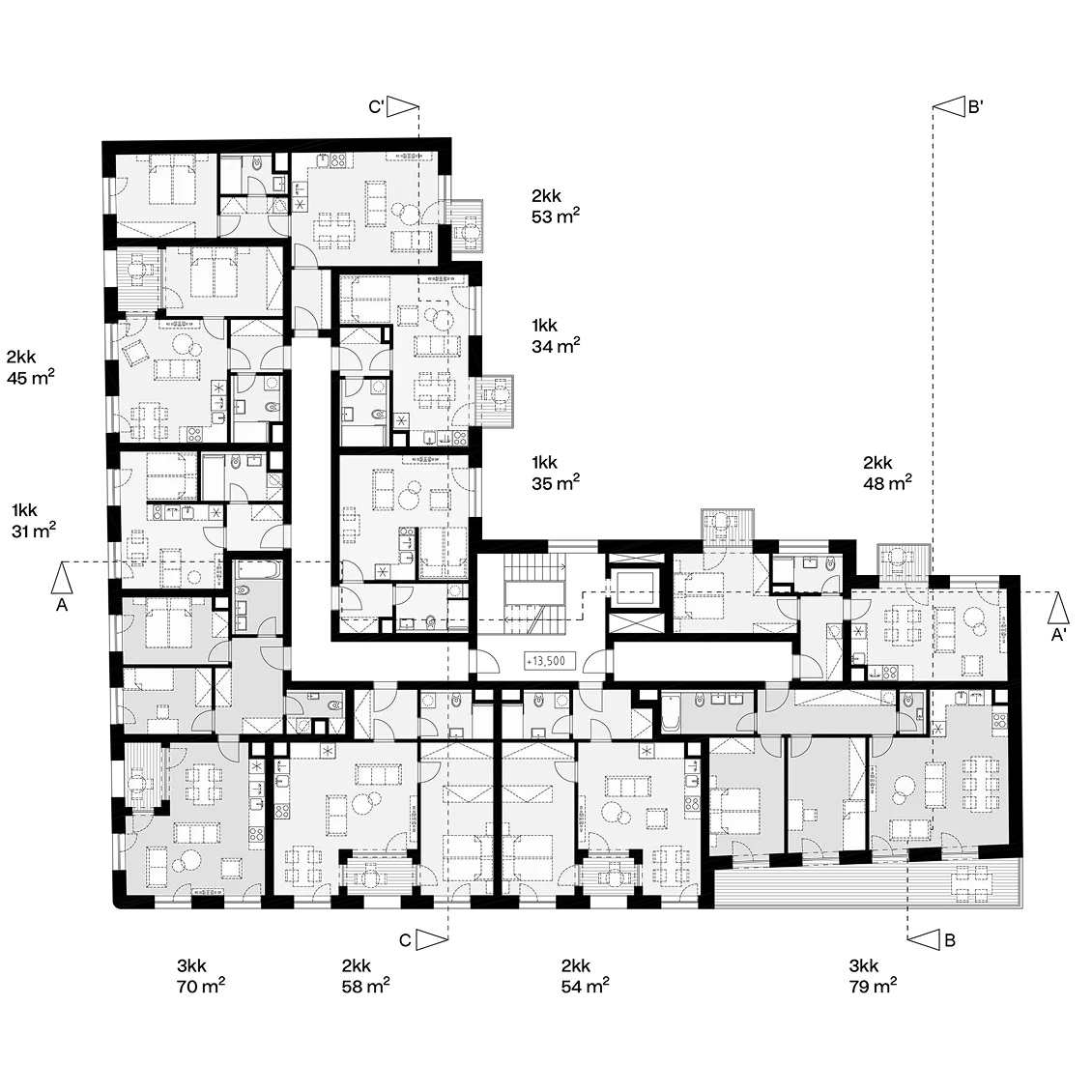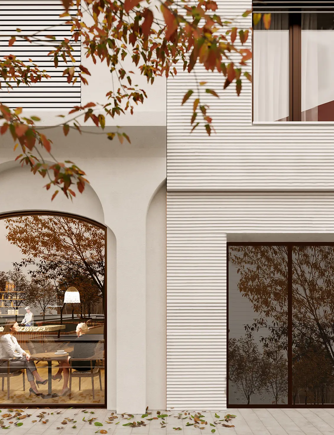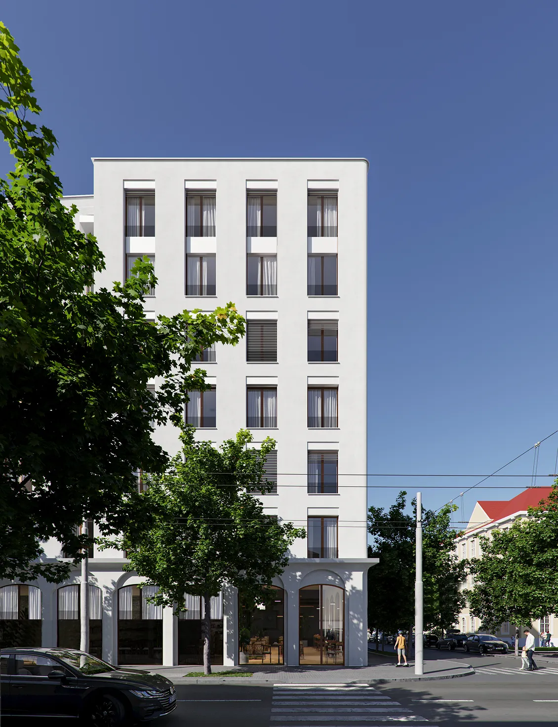 Inspirovali jsme se elegancí historických činžovních domů ze začátku 20. století. Abychom navázali na historii, využili jsme klasické prvky jako členění fasády pomocí římsy, oblouková okna v přízemí, zaoblení nároží, jednotnou velikost a pravidelné uspořádání oken. To vše v moderním, čistém pojetí s důrazem na detail a kvalitní materiály.