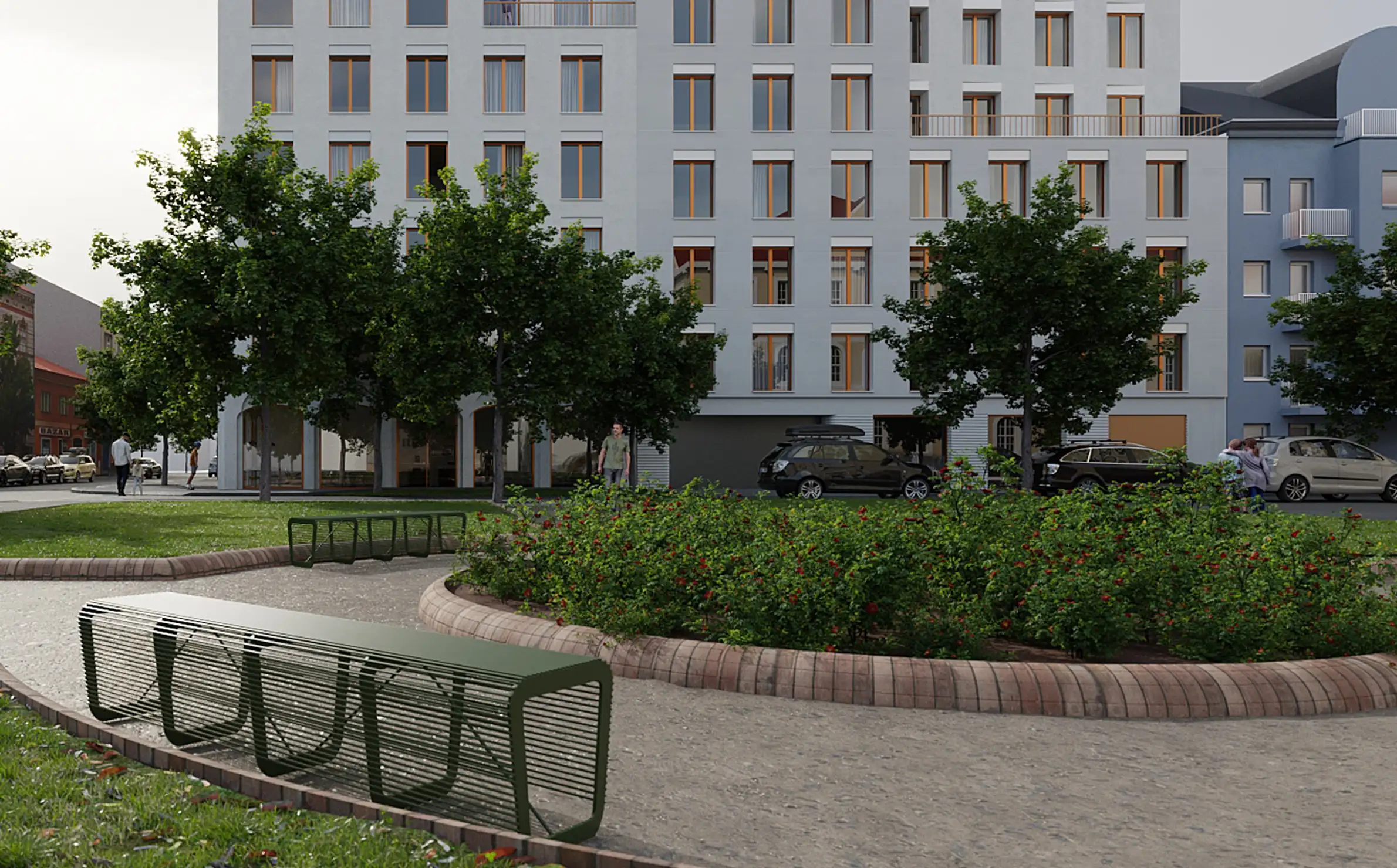 Stejnou pozornost dostal také parter – v takto živé čtvrti se vyloženě nabízel prostor pro obchod nebo kavárnu. Zároveň s tím obnovujeme a doplňujeme lipovou alej v ulici Heldova, aby byl prostor ulice co nejpříjemnější.