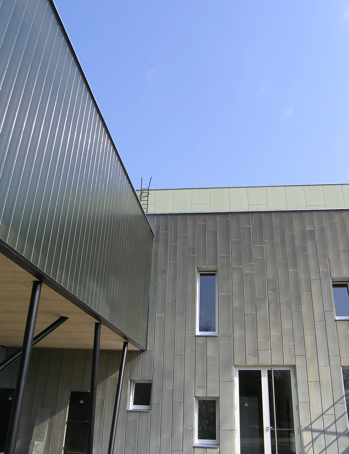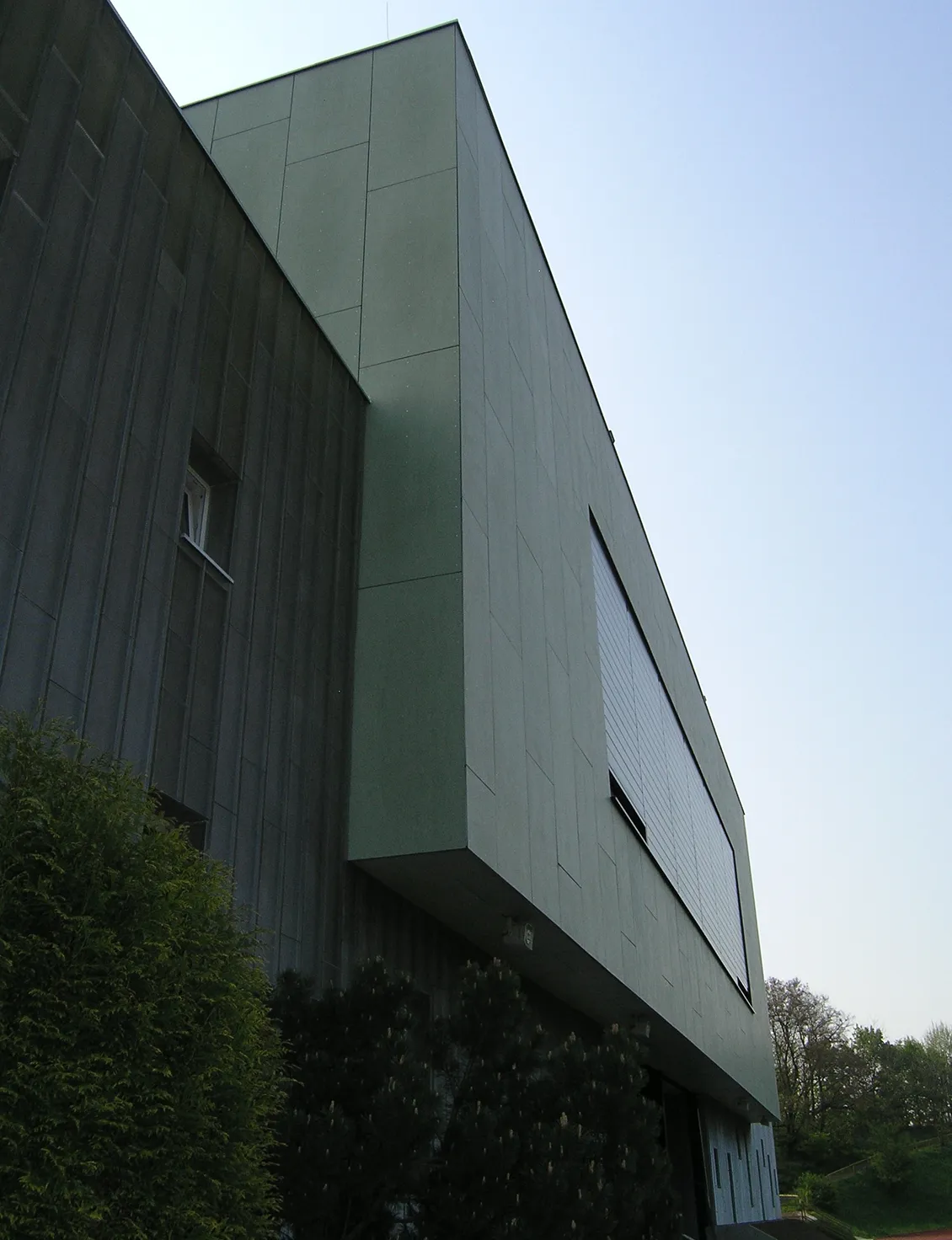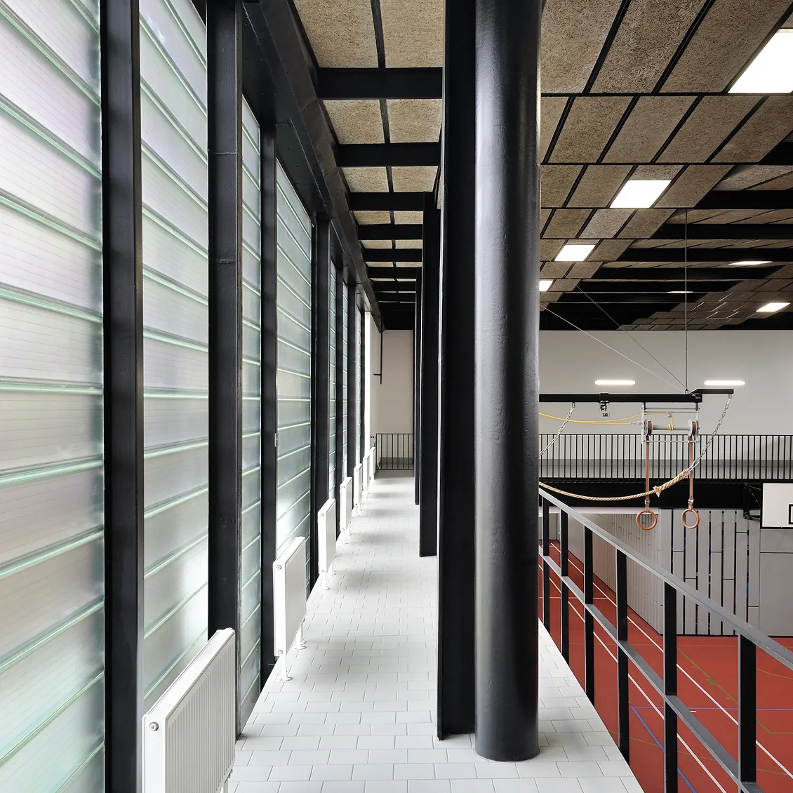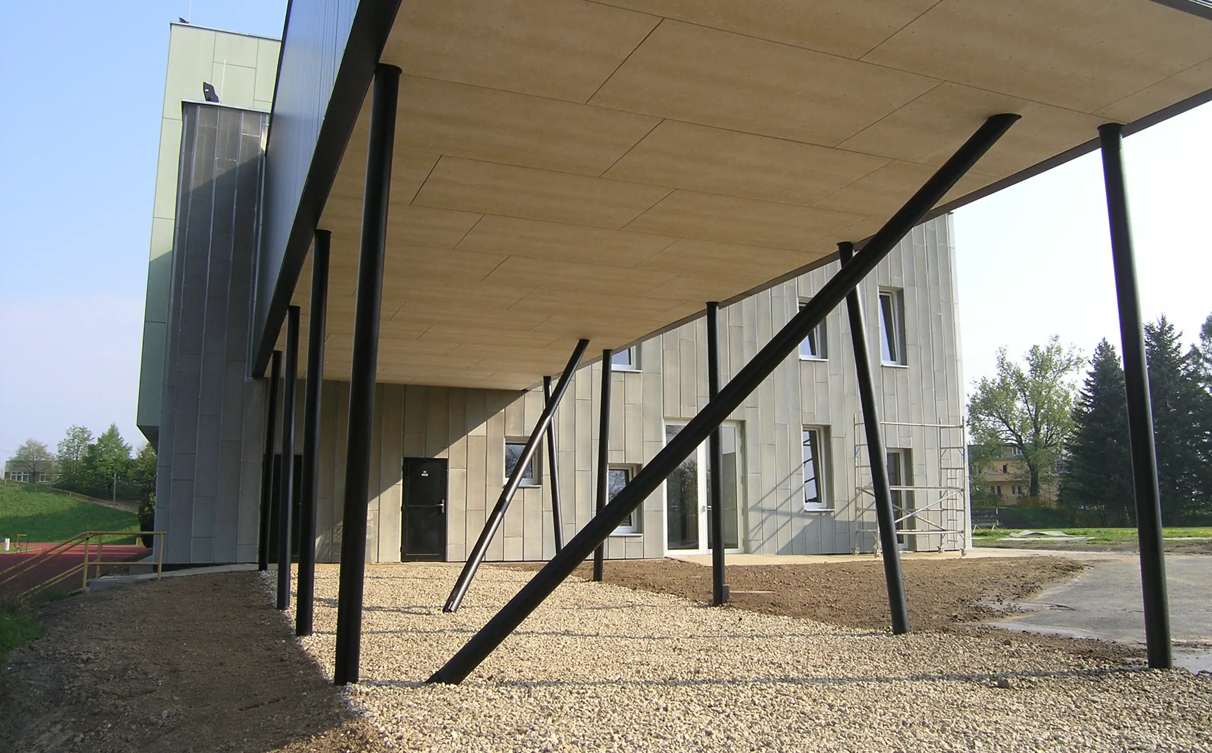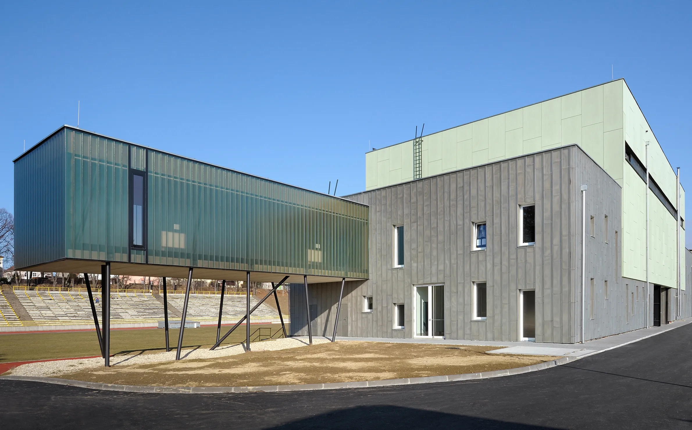 Budova je opticky tvořena třemi kvádry, z toho jeden, který je součástí kryté běžecké dráhy, zdánlivě levituje ve vzduchu. Vzdušná ocelová konstrukce, která jej vynáší, připomíná hru mikádo. Fasáda přízemní budovy je zpestřena asymetrickou hrou převážně vertikálních oken.