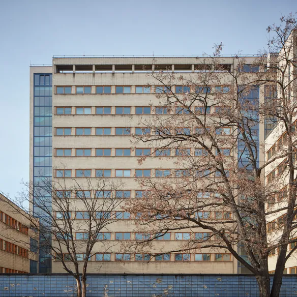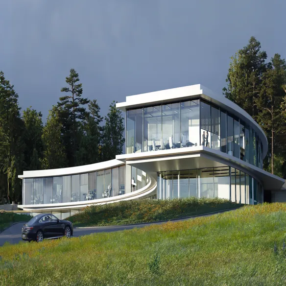 Budova je opticky tvořena třemi kvádry, z toho jeden, který je součástí kryté běžecké dráhy, zdánlivě levituje ve vzduchu. Vzdušná ocelová konstrukce, která jej vynáší, připomíná hru mikádo. Fasáda přízemní budovy je zpestřena asymetrickou hrou převážně vertikálních oken.