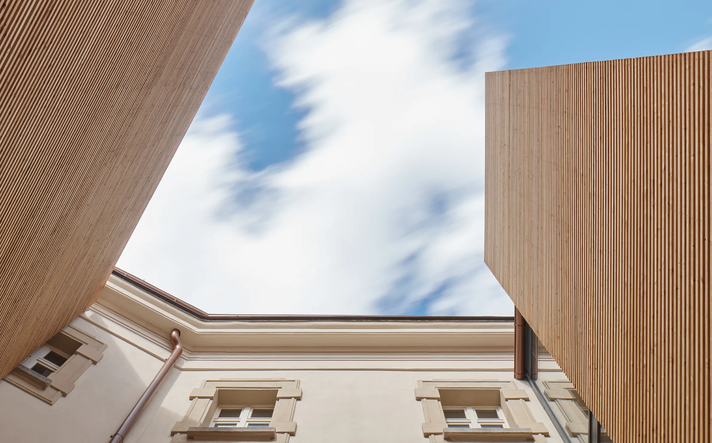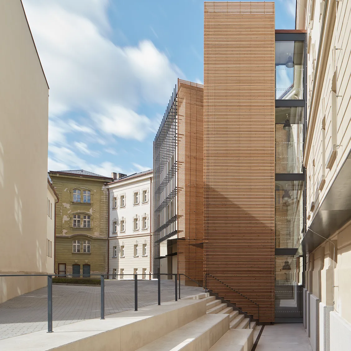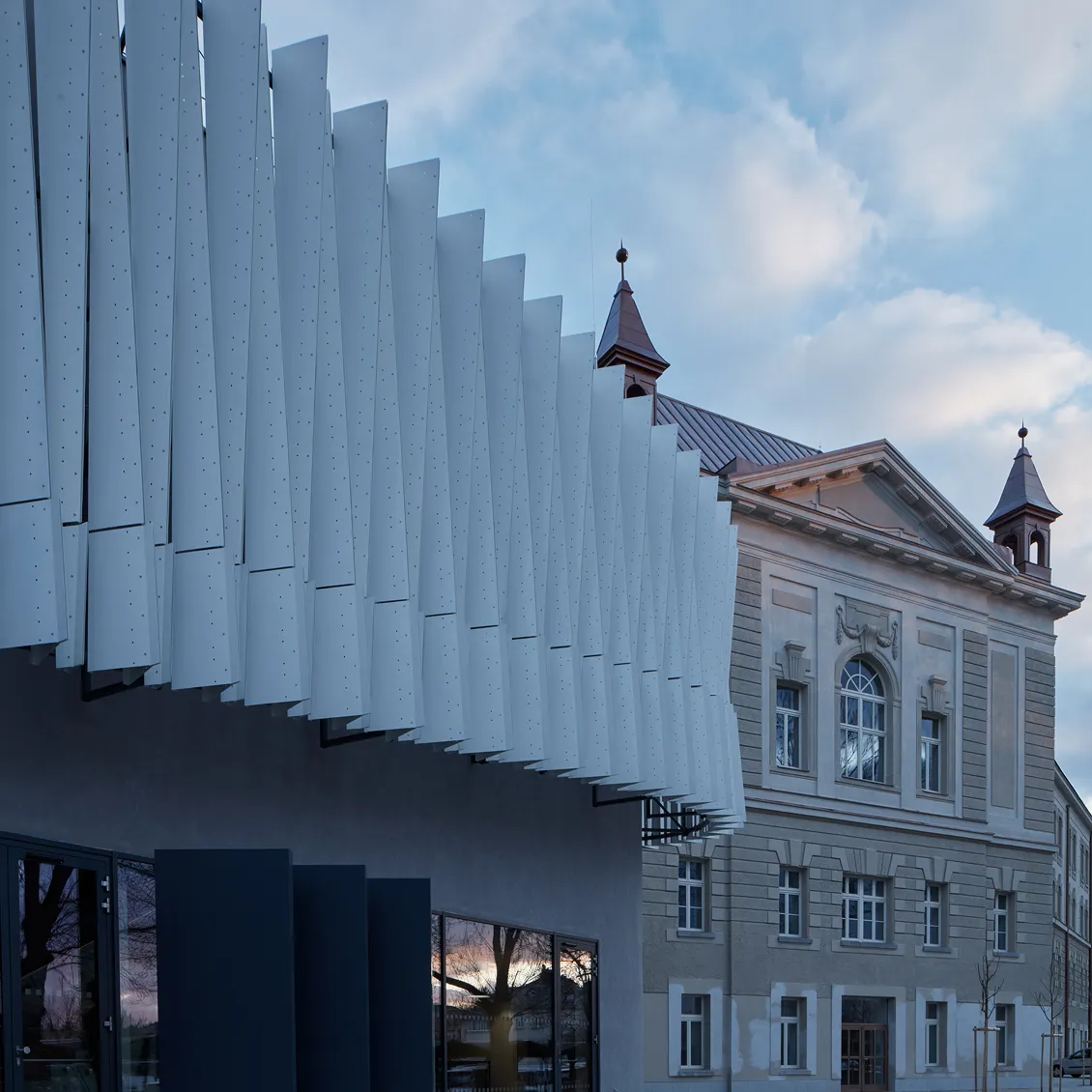 Parcela pro novou stavbu byla přísně symetrická s nepříliš vhodným trojúhelníkovým tvarem. Podařilo se nám ale změnit nevýhodu ve výhodu a díky návaznosti na stávající zástavbu jsme získali kompaktní objem a budovu jsme otevřeli městu.