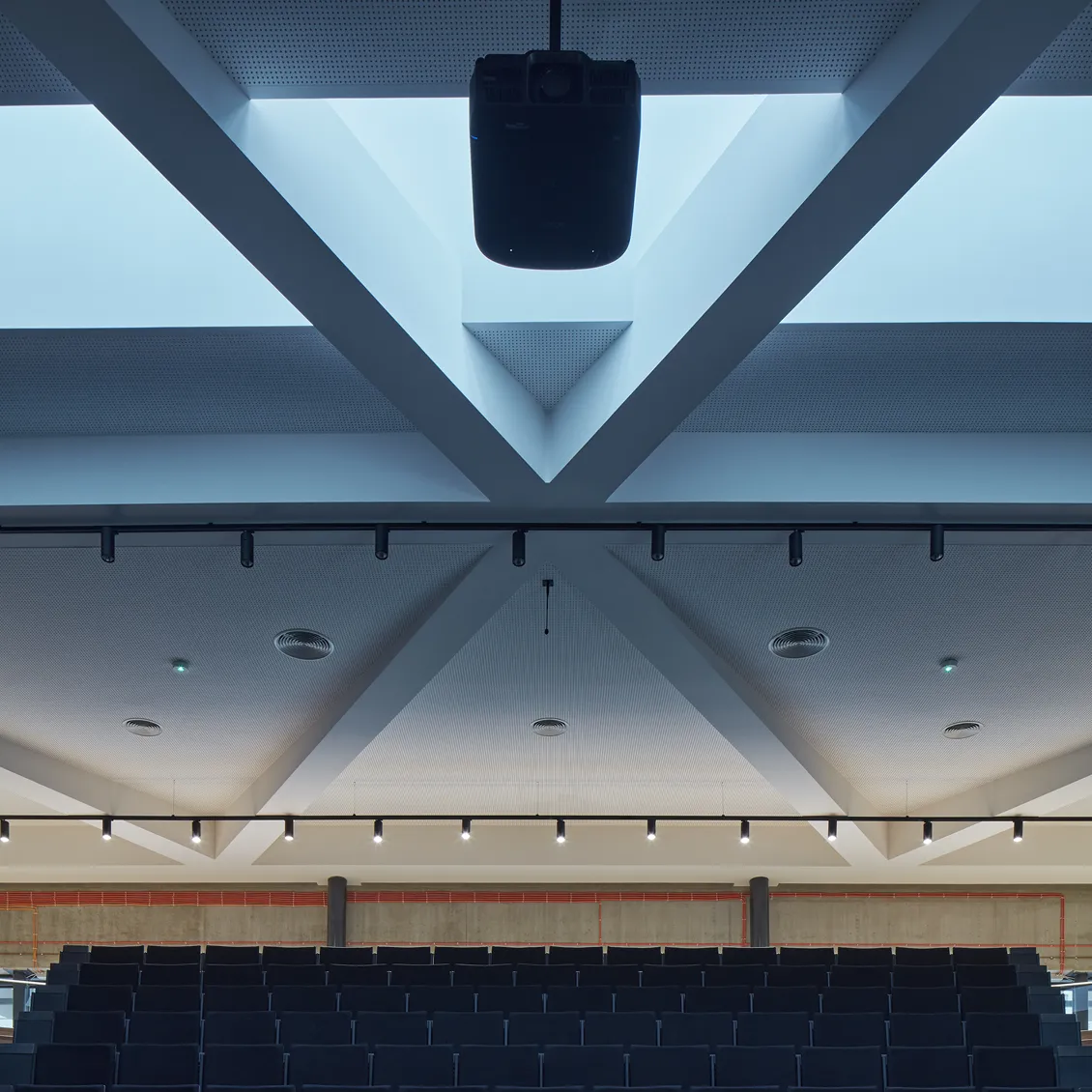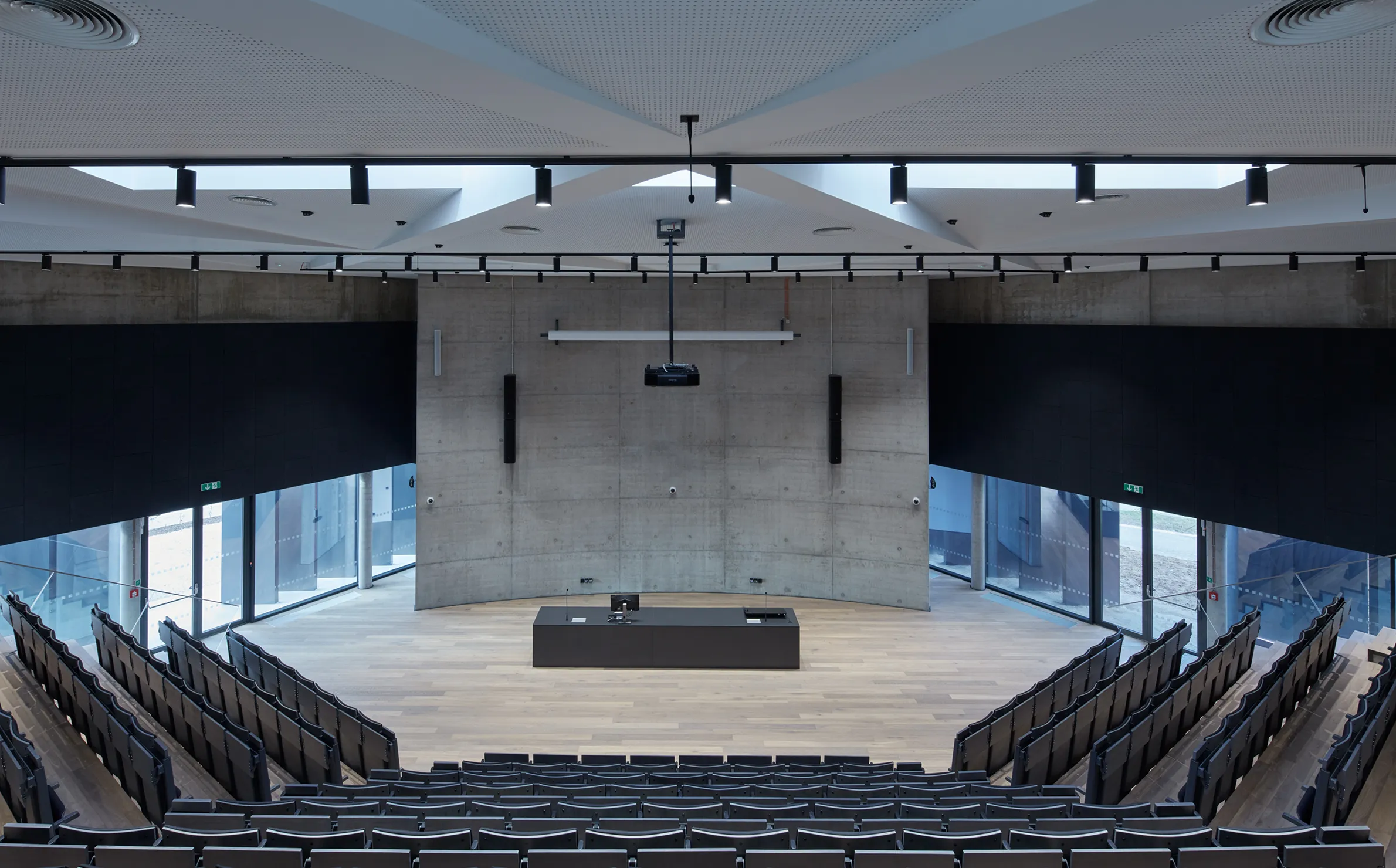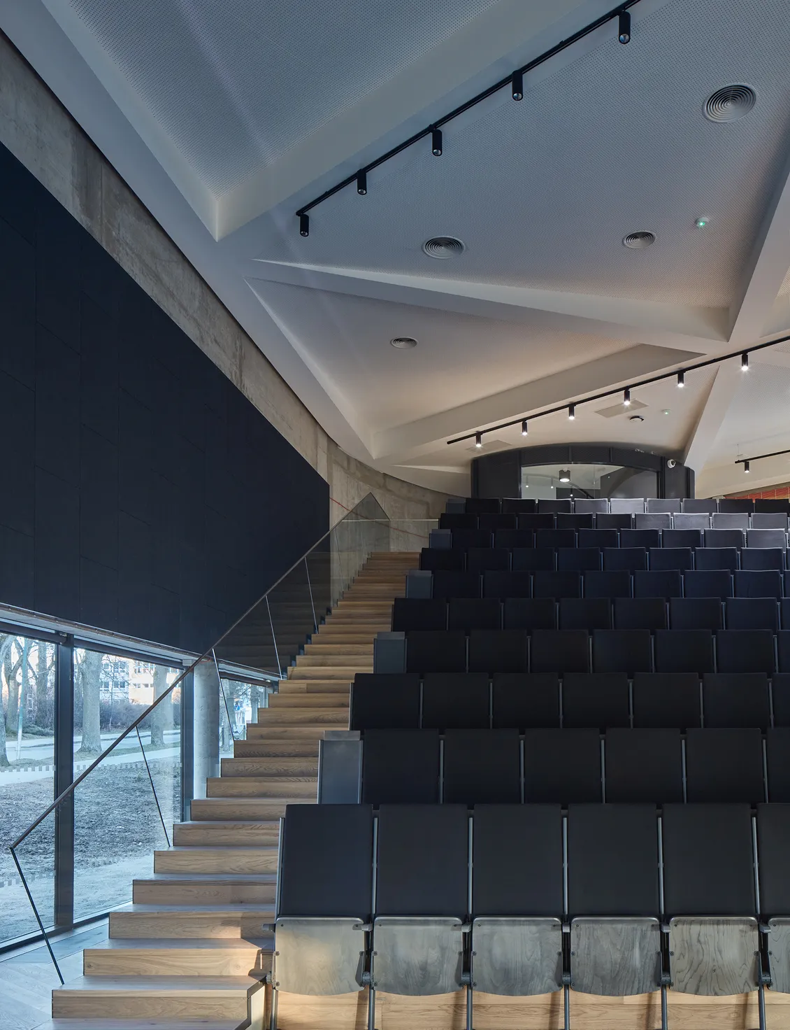 Parcela pro novou stavbu byla přísně symetrická s nepříliš vhodným trojúhelníkovým tvarem. Podařilo se nám ale změnit nevýhodu ve výhodu a díky návaznosti na stávající zástavbu jsme získali kompaktní objem a budovu jsme otevřeli městu.